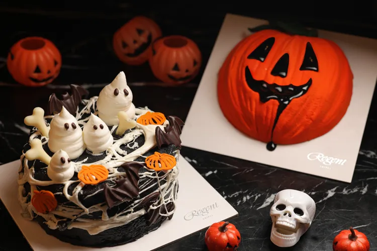 晶华酒店一楼Regent Gift Shop针对万圣节推出多款造型俏皮可爱、品尝起来精致可口的甜品。其中最吸睛的「黯夜黑丝绒蛋糕」是将竹炭海绵蛋糕与浓郁香甜的草莓酱层层堆叠,外层覆盖竹炭香草奶油霜,缀以翻糖及巧克力制成的大小幽灵、蜘蛛网及南瓜,使其充满奇幻意象。另一款俏皮可爱的「午夜南瓜榛果巧克力」是由牛奶巧克力慕斯、榛果及香草奶馅组成,再以橘色巧克力翻糖制成南瓜造型,滋味犹如魔鬼的诱惑,绝对让人难以抗拒。而「黯黑蝙蝠抹茶慕斯」是以杏仁抹茶蛋糕为基底,结合茶香浓郁的抹茶甘纳许、酸甜清爽的柑橘酱与香甜脆饼堆叠口感层次,上层再放上幽灵、南瓜怪等造型巧克力,兼具趣味及美味。