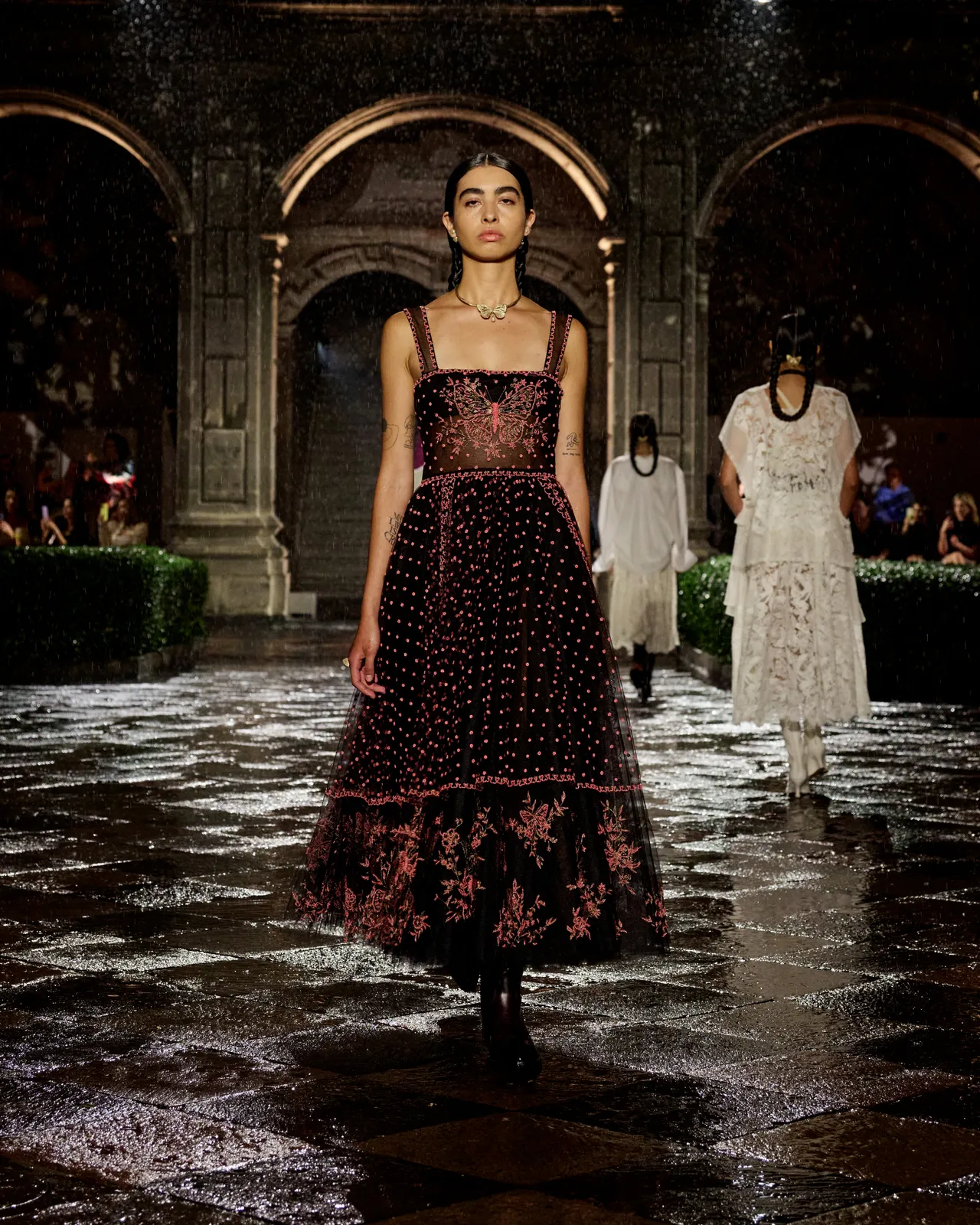 当然,Chiuri的创作总是围绕著女性力量打转,在夜晚细雨交织中行进的模特儿,更有种异常地悲壮感,不过她们身上的服装,却是像火焰般燃烧著。芙烈达的传奇一生,被巧妙转化在DIOR独到的法式优雅轮廓中,她19岁穿上的3件式西装,与被称之为huipil的墨西哥传统服饰,都在伸展台上被赋予了新生;伞裙搭配束腰外衣的造型,亦演绎了芙烈达钟情的Tehuana地区装著风俗。1件抢眼粉色的洋装,令人直觉联想到了芙烈达在1幅自画像中的形象,当「文化挪用」在时尚界已需戒慎恐惧之时,DIOR选择紧密与墨西哥当地艺术家合作,在传承古早手艺的同时,亦为当地6个原住民社区带来了意想不到的资源交流。