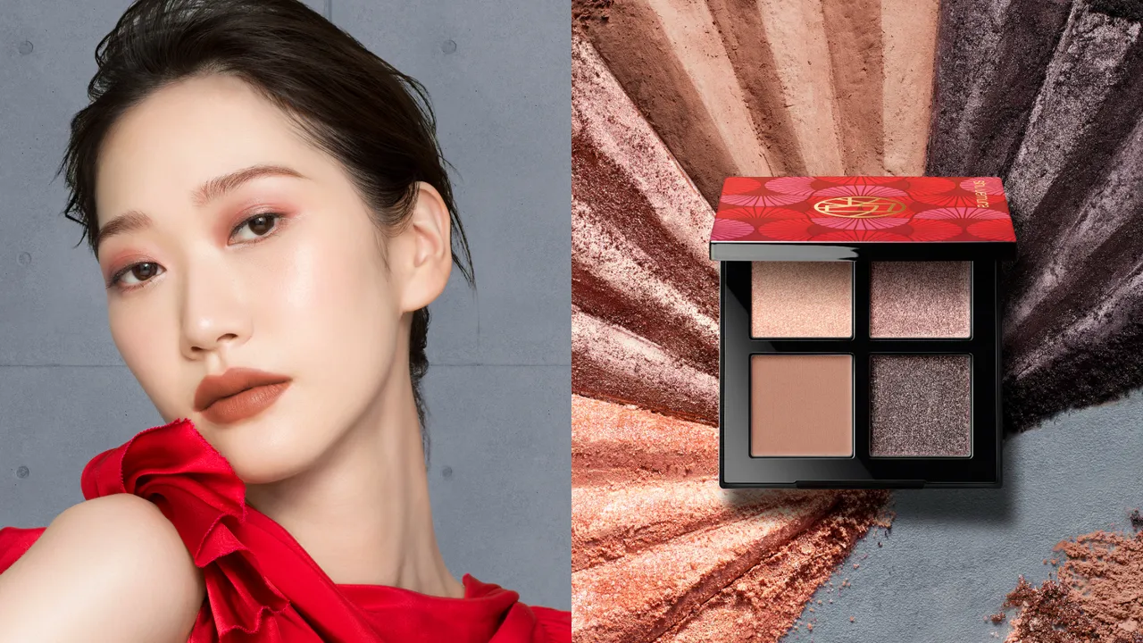 植村秀新年以「扇子」为灵感推出时尚大师4色眼影盘新年限量版,以4种低奢裸色交织4种细腻质地,包含静谧粉色与温暖裸棕色,再搭配上米色细闪亮片,造出如扇形的精致高级感立体眼妆。