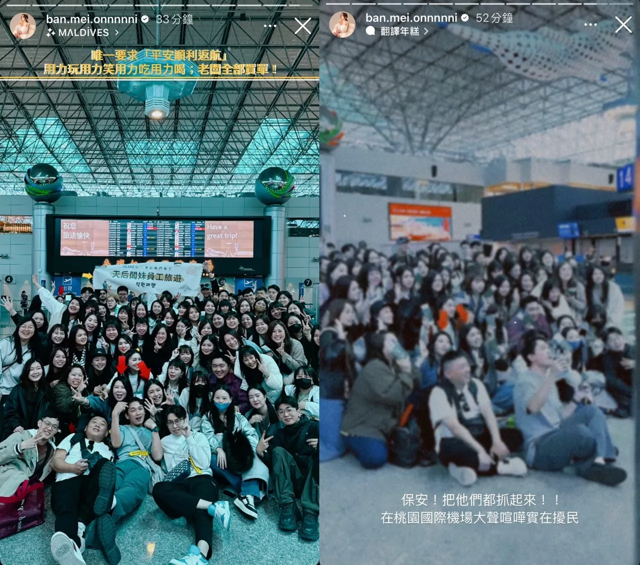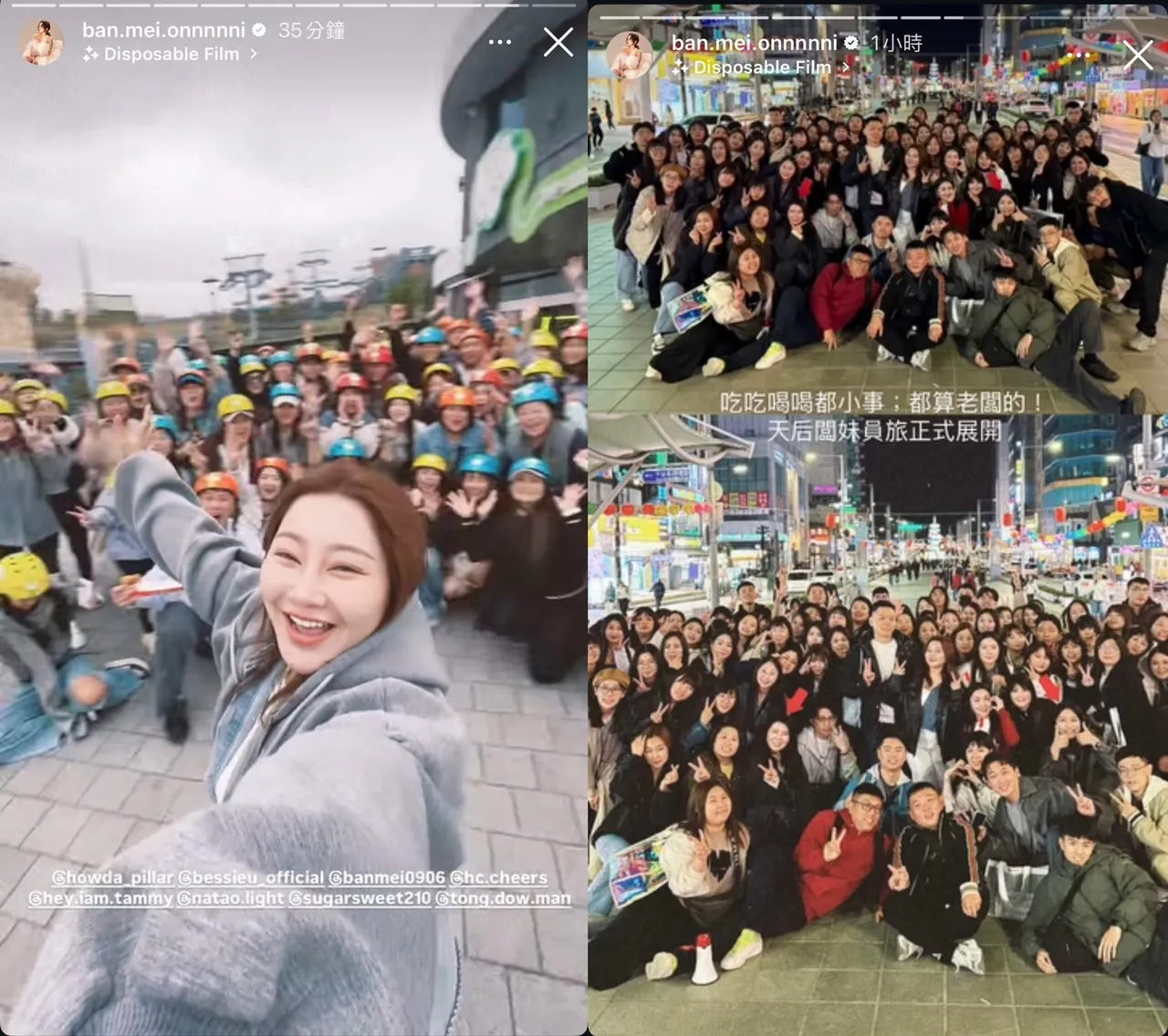 这场员工旅游堪称「史诗级」,天后板妹16日在IG晒出限时动态,一行人齐聚桃园机场合影,手拿「天后板妹员工旅游」的大布条,镜头前大家脸上满是笑意,还比出胜利手势,照片中标注文字写著「平安顺利返航、用力吃喝、老板全买单!」现场气氛超热烈,堪比大型粉丝见面会,抵达韩国后,9台超高等级的豪华保母车一字排开接送员工,根本就是「韩流明星驾到」规格。