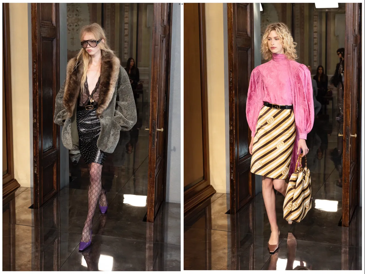 贯穿全系列的GG Monogram图腾,成为连结品牌符号的线索,而单一的G标志则重新诠释,在皮带扣、镶嵌设计及鞋跟上优雅现身。整体轮廓呈现出强烈结构化的肩线,夸张而宽大,同时又不失纤长柔和,完美诠释了从日间优雅滑入夜晚风情的多元面貌 。