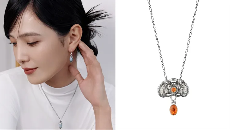 自古以来,琥珀便承载的保护与和平寓意,更寄托著温暖的祝福。此次最能呼应中秋节主题的,莫过于「MOONLIGHT BLOSSOM系列」的纯银琥珀胸针项链,以华丽构图呈现出新艺术运动时期强调的自然语汇与装饰美感,整体采用纯银材质,经氧化工艺雕琢出左右对称的立体叶形纹饰,银叶间托起细致花朵,镂空设计营造通透感,花心处则嵌有圆形琥珀,如秋暮般的暖橙光晕呼应中秋团聚的温馨氛围。