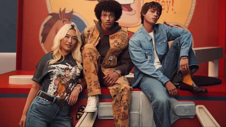 男装裤款推出双层膝盖的工装风格西部风喇叭裤、带有补丁细节的Loose宽松丹宁裤,以及以面粉袋印花布料呈现的Carpenter木匠风满版印花丹宁裤。而外观看不到的设计也充满细节,裤款皆设有专属口袋内衬,印有安弟的手写笔迹与胡迪图案,并以强化受力点和对比色缝线,展现拓荒时期工装的工艺精神。