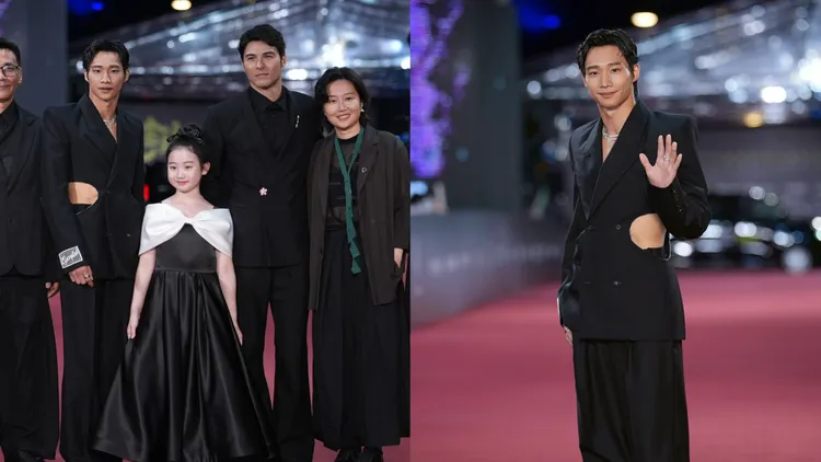 凤小岳、黄冠智此次以《人生清理员》分别入围迷你剧集(电视电影)男主角、男配角奖,2人一同牵起剧中的萌妹「乐乐」走上红毯,战袍则各有亮点。凤小岳全套造型皆来自Louis Vuitton,上身的俐落西装剪裁双排扣外套,为Pharrell Williams及Nigo合力设计的2025秋冬款式,靠近下摆处则缀Monogram标志装饰的粉红色折纸樱花钮扣,黑色喇叭裤则穿出潇洒样。黄冠智换上EGONLAB西装搭配Christian Louboutin皮鞋、Piaget珠宝,其中,西装外套双侧以肤色拼接呈现镂空设计,伪性感风格相当吸眼球。