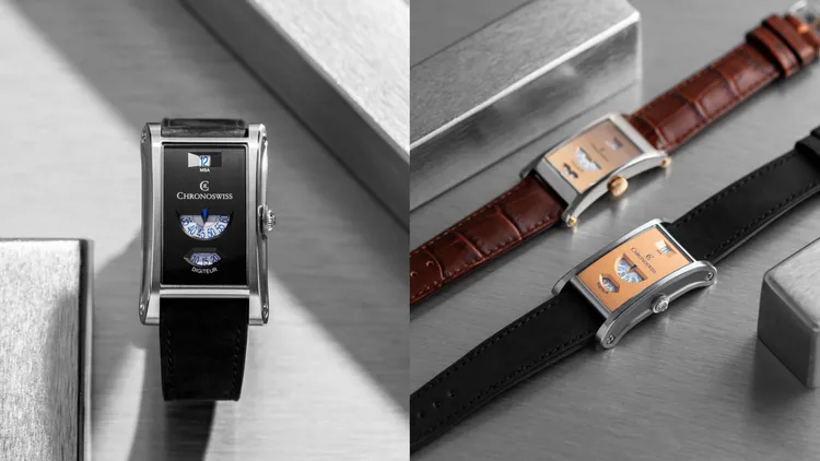Neo Digiteur最鲜明的印记,来自其雕塑感十足的几何长方圆形表壳。48x30mm的不锈钢比例在锐利与柔和之间取得微妙平衡,侧面以水平喷砂与抛光工艺交错,呈现细腻的光影层次。标志性的洋葱型表冠也被重新调整,底部改为平面,使经典造型在手腕上更贴合、更流线。