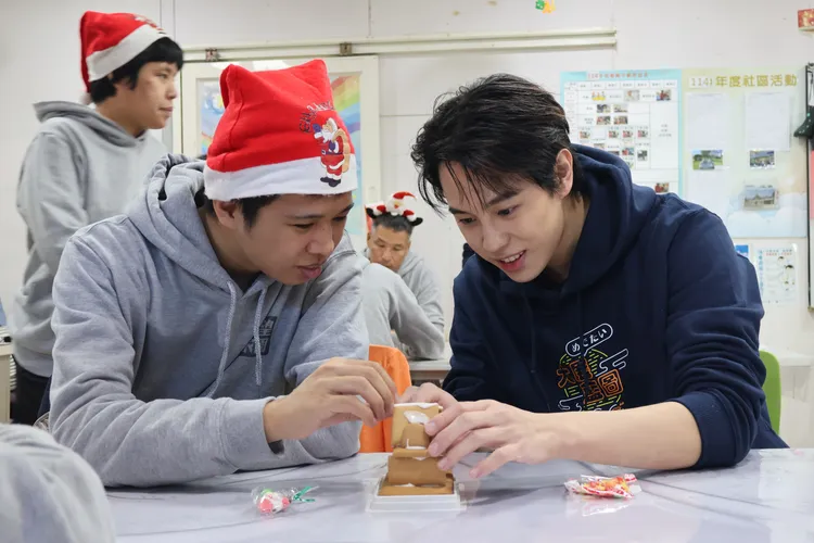 除了音乐互动,孙麦杰也亲自加入制作姜饼屋行列,从拼装到装饰全程陪伴,笑声不断。他分享过程中的暖心片刻:「在做姜饼屋的时候,有一位憨儿主动关心我有没有吃早餐,那个眼神很纯粹,也感受到他的温暖,反倒疗愈了我的心灵。」他更准备披萨与孩子们开起美食派对,并穿上基金会推广的公益年菜 T 同乐。