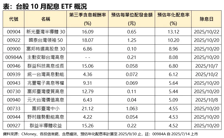 根据 CMoney 统计,10 月除息台股 ETF 共 12 档,最吸睛的莫过于新光台湾半导体30(00904)。继上季每单位配发 0.48 元后,本季预估再拉高至 0.65 元,创挂牌以来新高,以 9 月底收盘价计算,年化配息率高达 13.10%,成为半导体 ETF 中的新科冠军,也是本次统计首度拿下 10 月配息率王。另一档采半年配息的国泰台湾领袖50(00922),预估每单位配息 1.25 元,年化配息率突破 10%,同样创下该档上市以来最佳纪录。