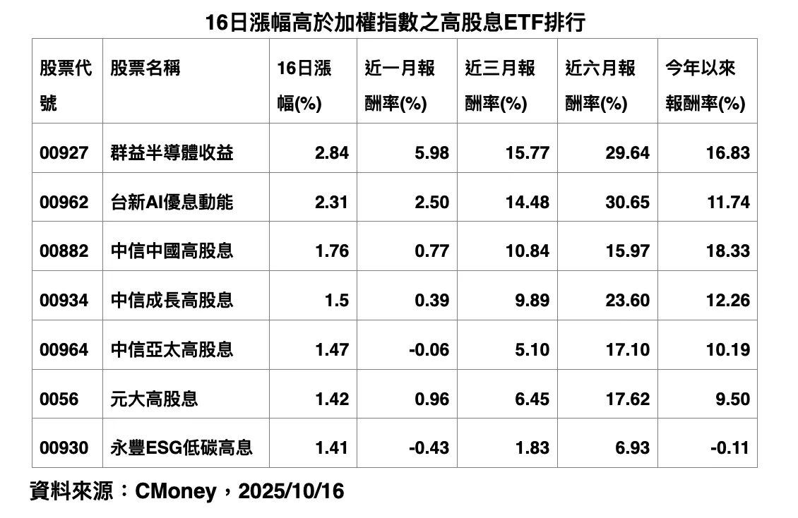根据统计,16日涨幅胜过大盘的7档高股息ETF依序为群益半导体收益(00927)上涨2.84%、台新AI优息动能(00962)上涨2.31%、中信中国高股息(00882)上涨1.76%、中信成长高股息(00934)上涨1.5%、中信亚太高股息(00964)上涨1.47%、元大高股息(0056)上涨1.42%,以及永丰ESG低碳高息(00930)上涨1.41%。这波上攻反映AI与高息题材同步发酵,不仅显示电子股涨势整齐,亦突显资金对收益型标的的青睐。