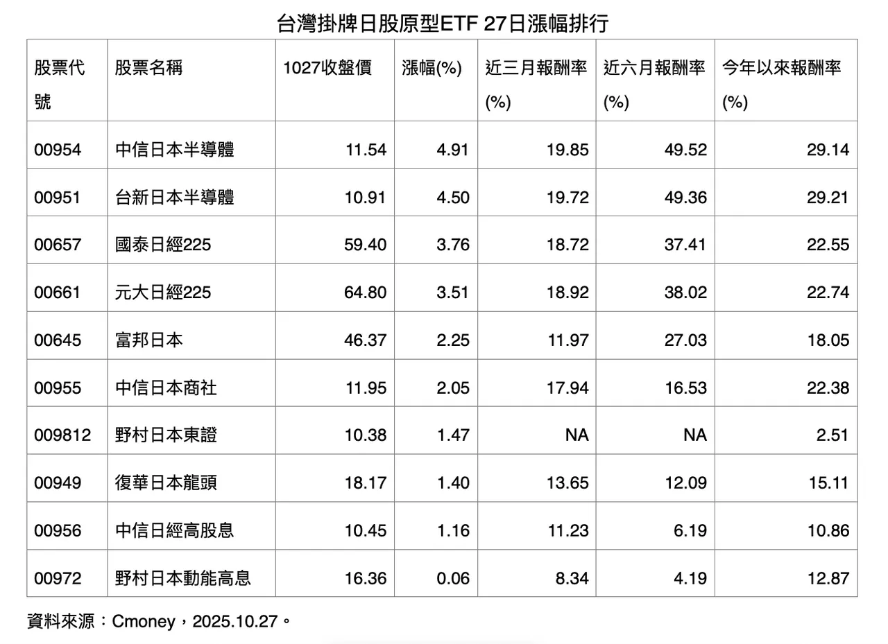 在台挂牌的多档日股ETF同步飙涨,其中,中信日本半导体(00954)劲扬近5%。中国信托投信指出,美中于吉隆坡谈判获得突破,中国将恢复购买美国大豆并暂缓稀土出口管制,美国则不加征100%关税,降低外部不确定性。同时,美国最新通膨数据降温,也使市场更预期联准会将再次降息。