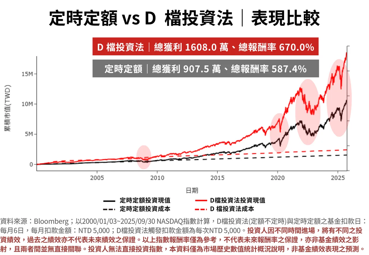 此外,APP内建多项长期投资辅助工具,包括自2013年推出的「D档投资法」,可于基金净值低档自动加码,以提升长期报酬。以NASDAQ指数回测为例,2000年至2025年期间,每月定时定额投资5,000元累积1,062万元,若采D档投资法加码,资产可达1,848万元。另有「活利循环」母子基金配置方案,协助投资人灵活运用闲置资金。
