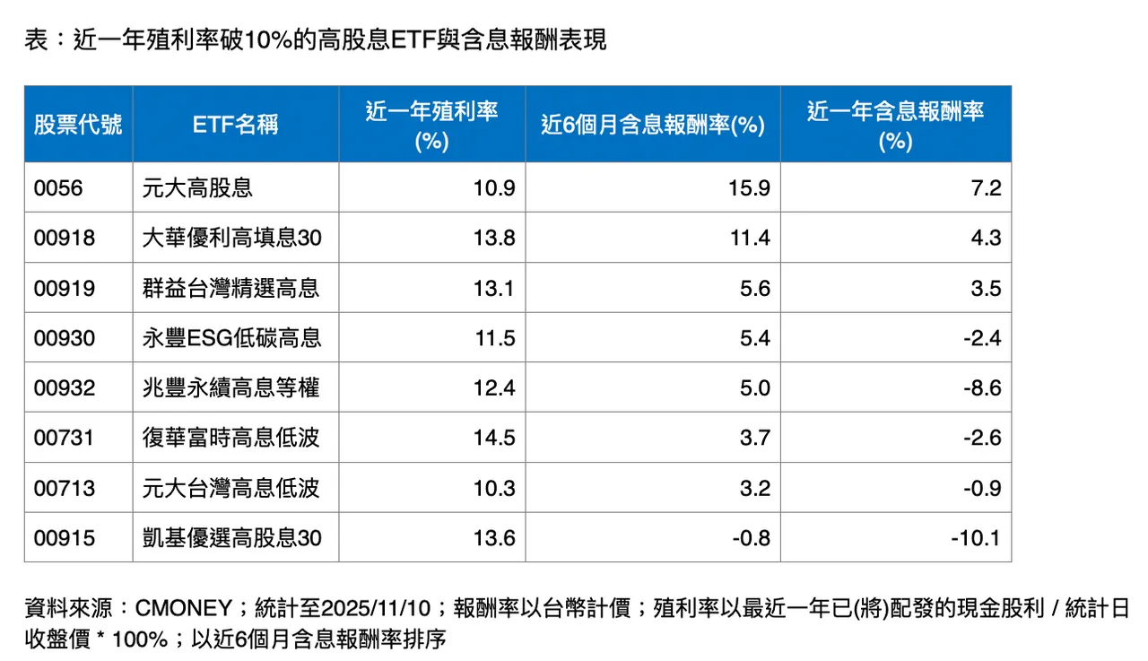 根据统计,目前台股挂牌的高股息ETF中,近一年殖利率超过10%的共有8档,但同期总报酬率为正的仅3档。若进一步观察「川普关税股灾」后近半年表现,能同时达成「殖利率逾10%、报酬率逾10%」双十佳绩者,仅大华优利高填息30(00918)与元大高股息(0056)两档,成为高股息族群中少数「息收、报酬」双赢的代表。