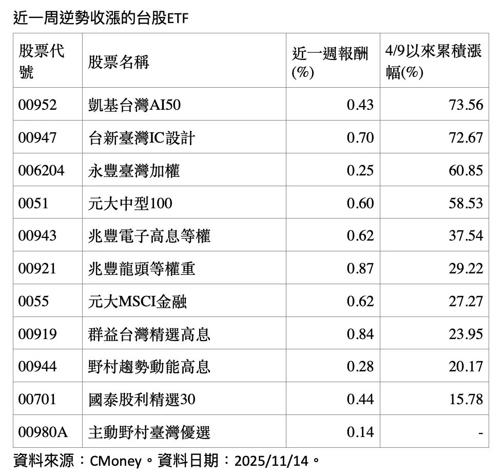 进一步观察这11档ETF自4月9日低点反弹以来的表现,其涨幅分布落在15%至73%之间,显示这些ETF不仅能在震荡盘中抗跌,也能在市场跌深反弹时展现强劲上涨动能。市场专家指出,在这批逆势上涨的ETF当中,有四档表现尤其突出,反弹涨幅全数突破五成,显示其在主流题材与资金轮动下更具优势。