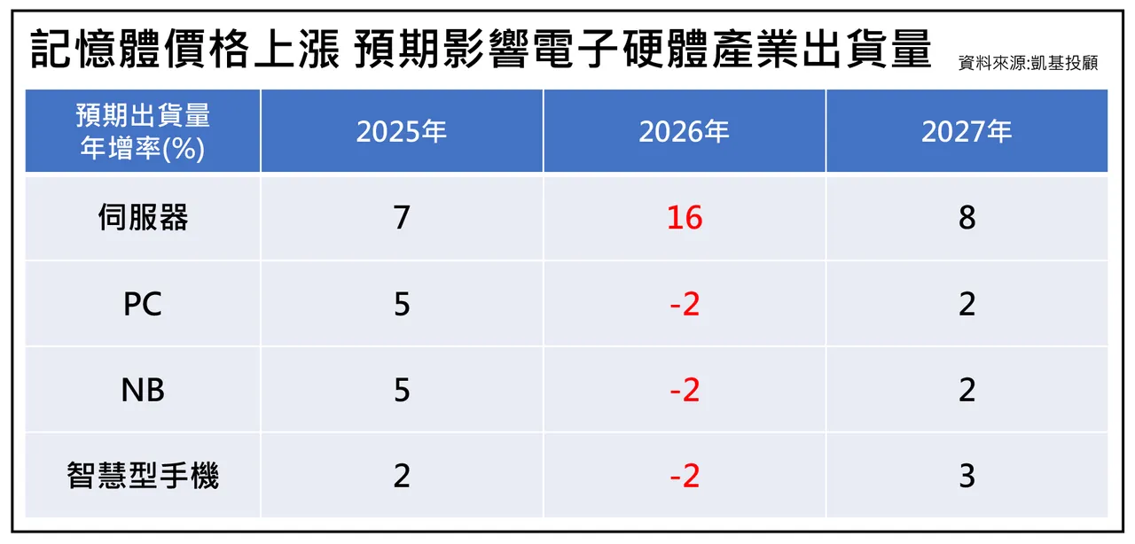 不过,记忆体上涨也带来另一面冲击。凯基投顾指出,由于 DRAM 与 NAND 涨幅显著,2026 年 PC 与智慧型手机的记忆体成本将年增超过 50% 至 60%,多数品牌势必调整售价以降低获利压力,导致消费意愿下滑。受此影响,凯基下修 2026 年全球 PC 出货量预估至年减 2%,反映消费型 PC 与 Chromebook 最受波及;全球智慧手机出货量同样下修至年减 2%,其中中低阶手机冲击最大,高阶如 iPhone 因长约保障及高记忆体比重,影响相对有限。