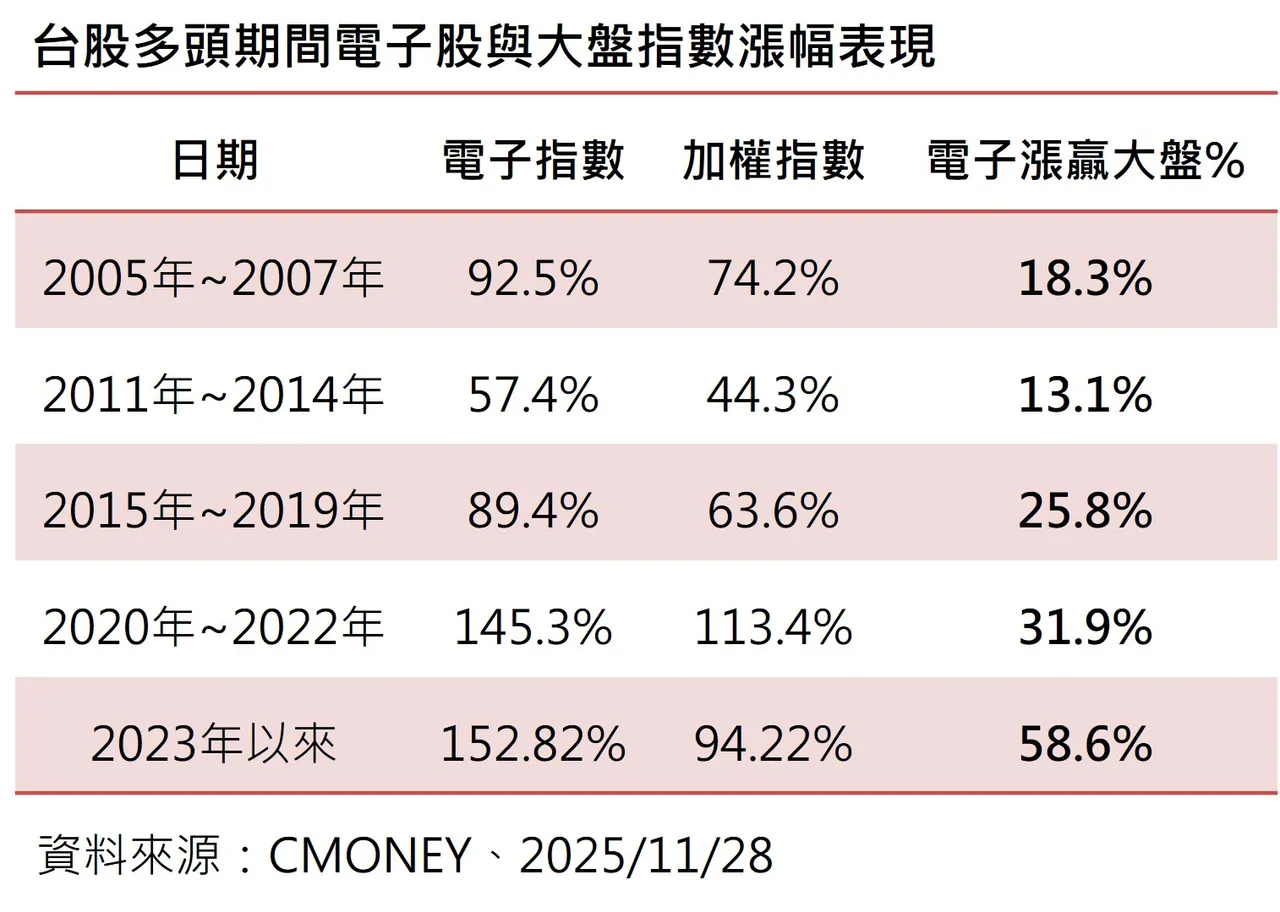 法人指出,自2005年以来,台股经历5段多头行情,而电子与科技创新族群均是主要推升力量。台湾科技产业紧贴全球创新浪潮,过去20年间电子指数在多头期间的涨幅长期胜过大盘;近十年科技股领涨幅度更明显扩大。今年在AI题材推动下,科技股再度成为大盘创新高的主因,展现强劲趋势力。