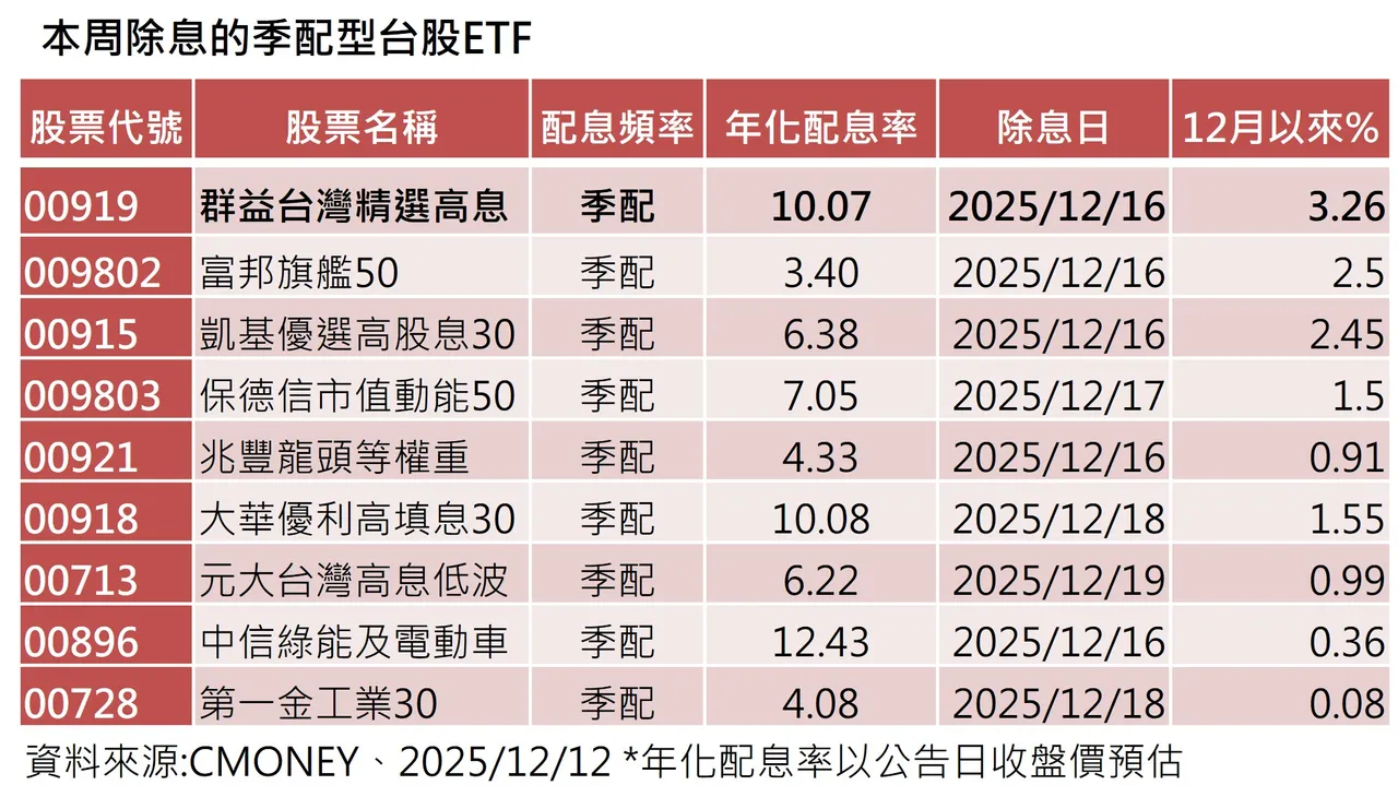 进一步观察本波将除息标的,以预估年化配息率来看,00919、中信绿能及电动车(00896)、大华优利高填息30(00918)等皆有10%以上水准;若以12月以来报酬率观察,00919累计涨幅约3.26%,表现相对突出,也让逾128万名受益人持续抱持信心。市场法人指出,00919已连续11季维持10%以上配息水准,在绩效与配息双重支撑下,兼具息收与潜在价差优势,最后买进日为12月15日,投资人可留意相关投资时点。