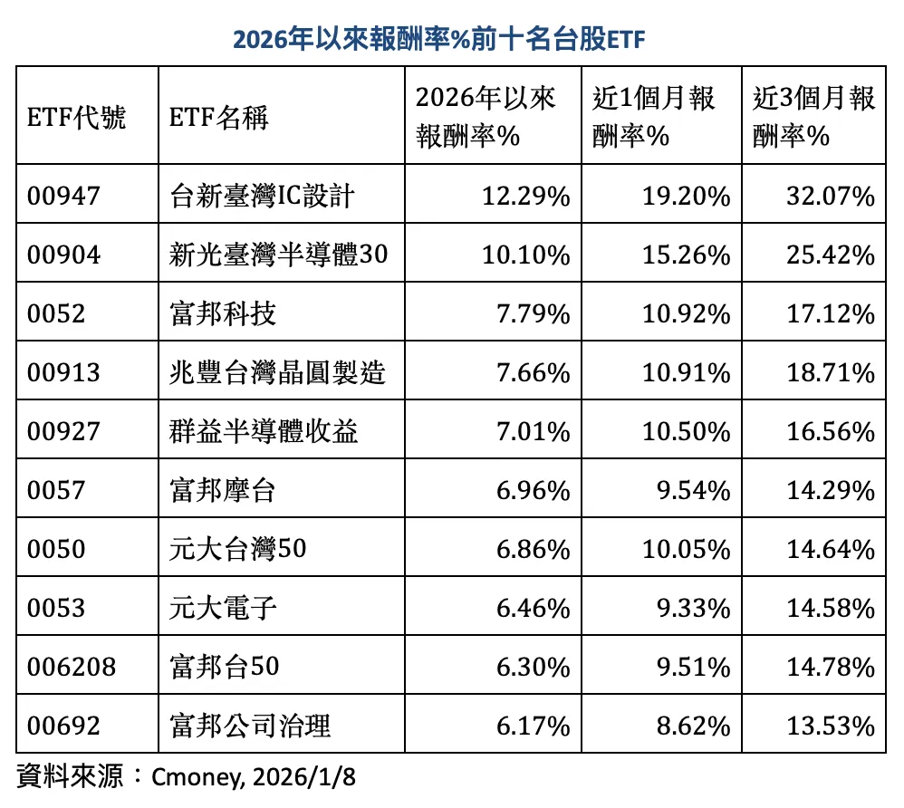 以今年来、近一个月及近一季报酬率皆居冠的台新台湾IC设计(00947)为例,其前三大持股华邦电(2344)、南亚科(2408)与群联(8299)权重合计超过三成,精准掌握这波记忆体行情大涨,加上1月配息金额上调五成的利多加持,吸引市场资金大举涌入,成交量快速放大。台新投信指出,记忆体股在ETF中的高比重,使00947成为本波多头的重要受惠者。