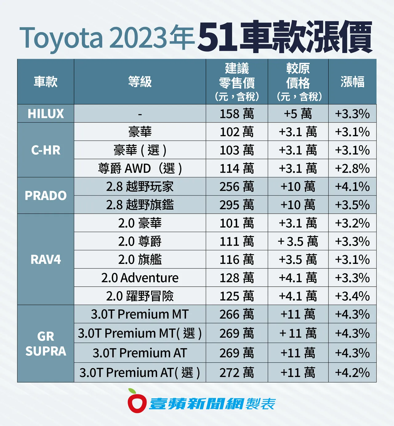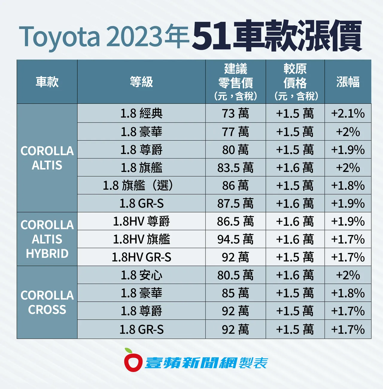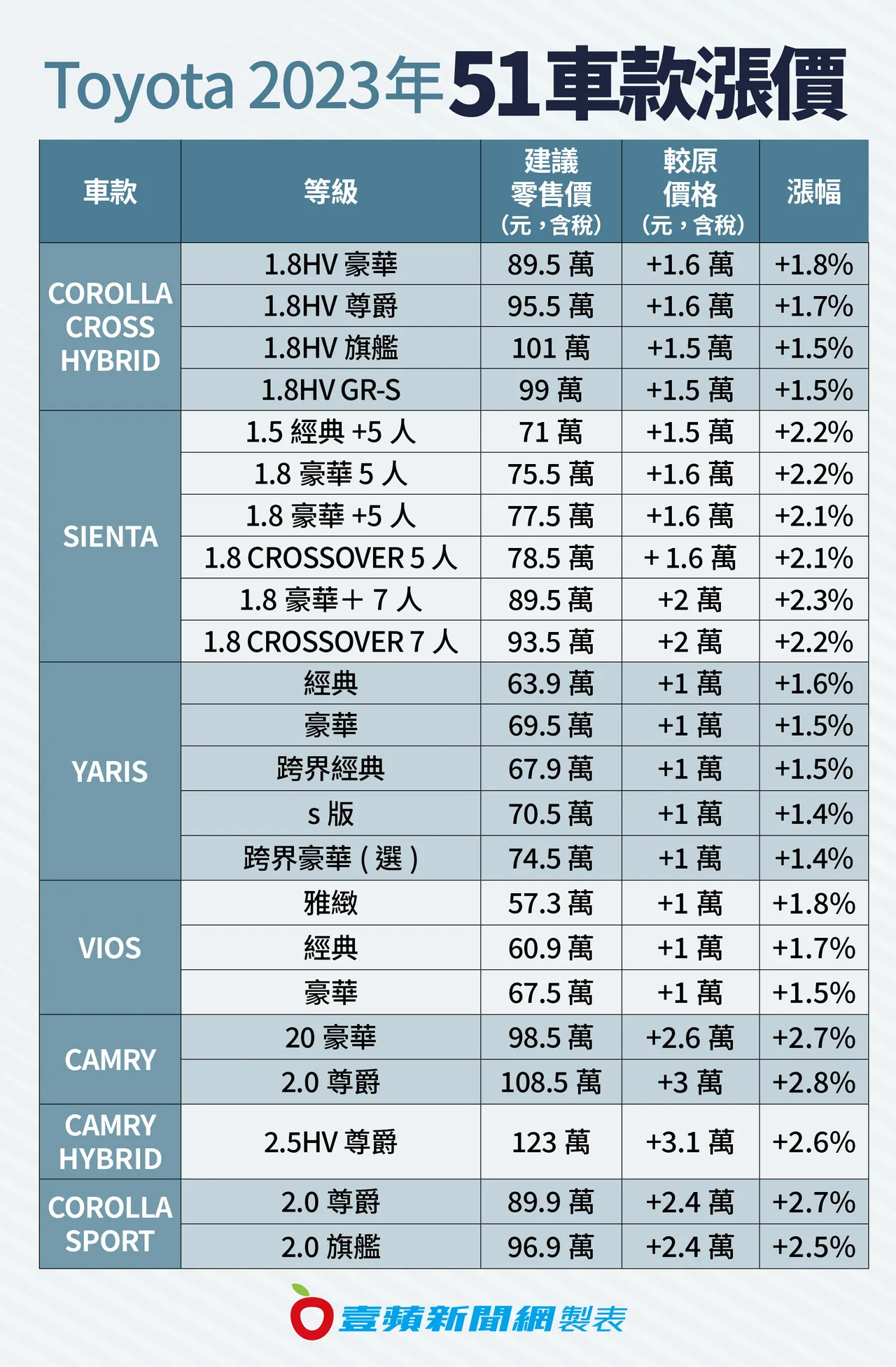 【记者林浩升/台北报导】自11/23和泰汽车在Lexus RX发表会现场,预告车价即将在明年续涨后,和泰汽车今(2日)正式宣布自明年1月1日起,调涨包含国产车及进口车售价,平均涨幅约为2%、依车型1到11万元不等。和泰汽车表示,今年以来车用原物料不仅缺料严重,且钢材、晶片、电池等重要零组件价格仍持续上涨,再加上人力、运输物流等费用堆叠之下,使得造车成本大幅攀升,日本原厂已无法完全吸收多重变数及压力,故调整上述车款售价。
