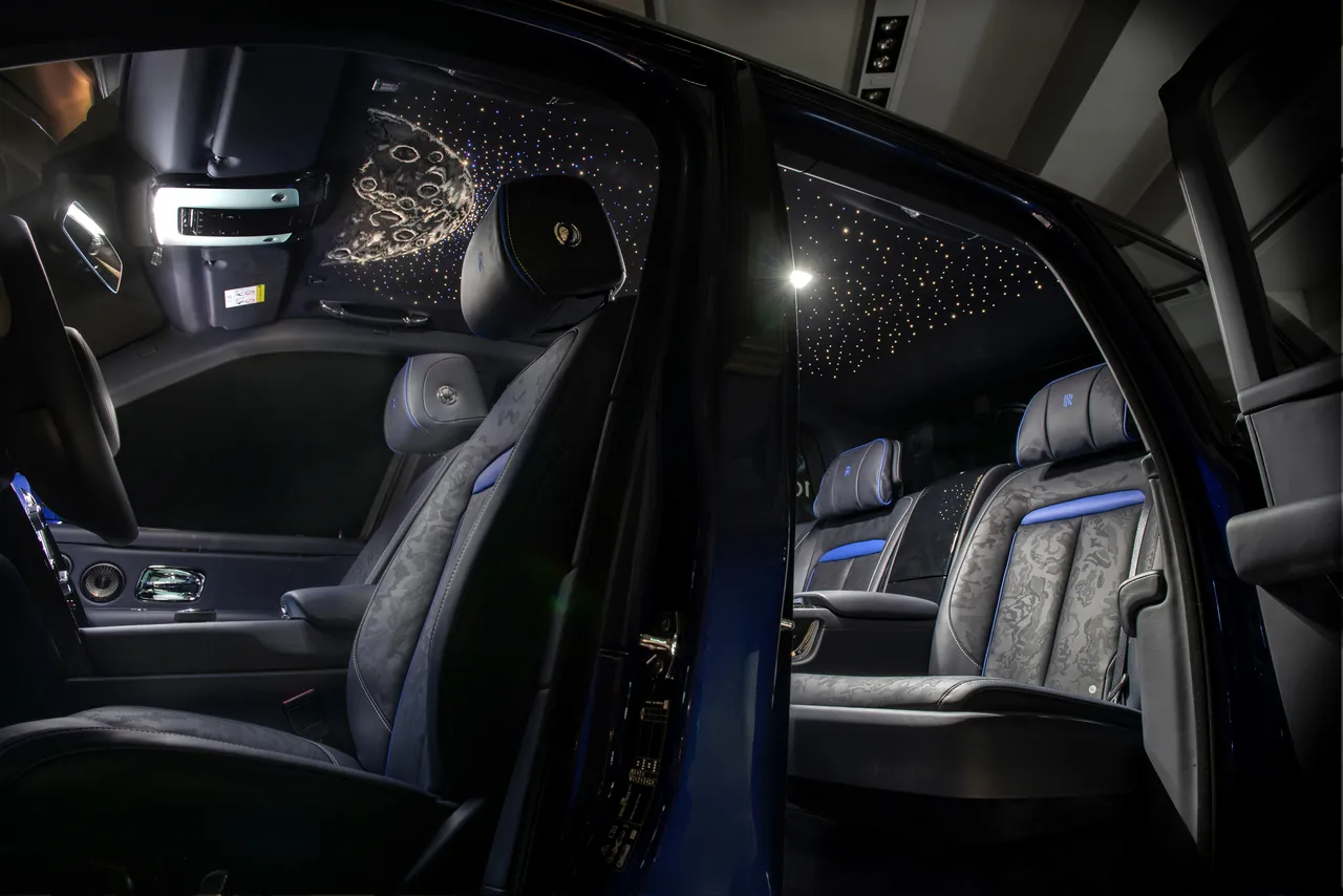 通过Black Badge Cullinan Blue Shadow车型,劳斯莱斯将品牌传奇的星光顶篷提升至更耀眼的水准,璀璨星光环绕中邃密繁复刺绣而成的月球图案仿若众星捧月,为乘客带来亲临太空边界的观感。月球图案刺绣使用了五种颜色的绣线,每种线均采用不同的绣法,创造出彼此各异的纹理,以三维的形式完美复现遍布陨石坑的月球表面。整幅刺绣作品经25万针最终绣成,这个过程需要耗时两天。