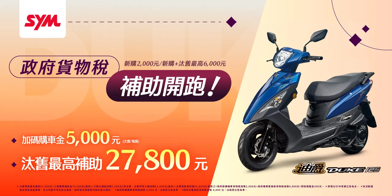 【响应政府货物税补助 迪爵125汰旧最高补助27,800元】