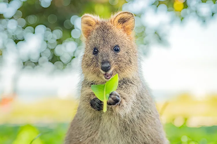 The quokka is native to Rottnest Island and can be found all over the island. It is a marsupial—a group that also includes the kangaroo, the koala, and the wombat. Like most marsupials, the quokka is most active at night and eats grasses and leaves. Covered in brown fur, each one can weigh up to five kilograms and typically lives for about 10 years. One obvious feature a quokka shares with a rat is a tail with little hair.