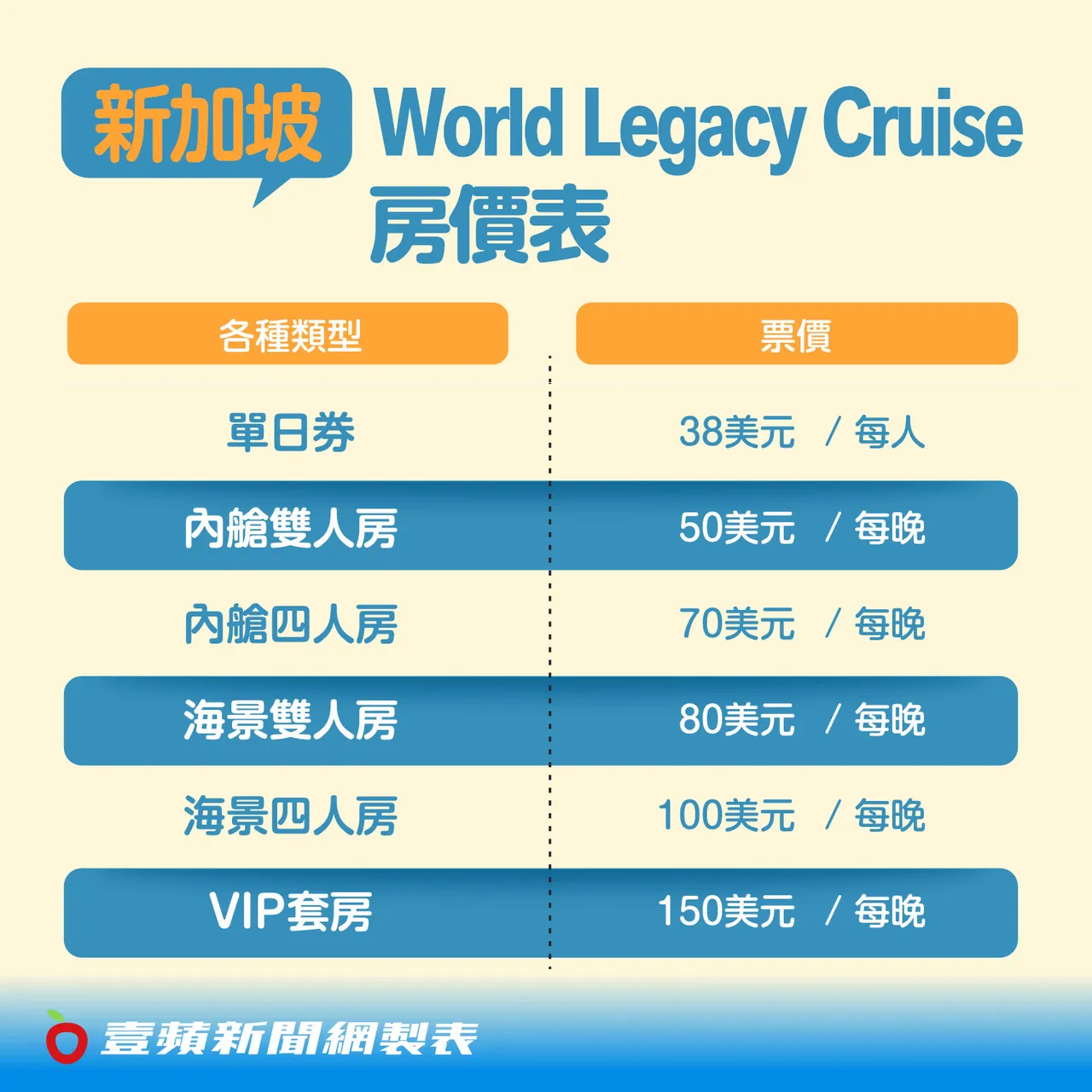 在我们深入介绍游轮的精彩活动前,我们首先介绍World Legacy Cruise提供的不同票券。除了让您在舱房、套房过夜的船票外,也有让您不须入住又能参与游轮所有活动与设施的单日券。以下是各种票券价格: