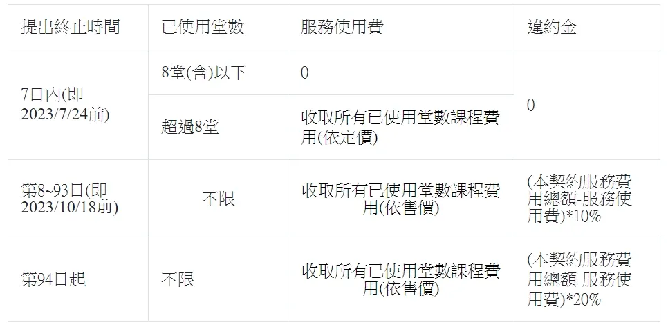 根据投诉人出示的TutorABC「服务契约书 」,第7条「终止契约与退费」写道,7日内(即2023/7/24前)已使用8堂(含)以下服务使用费0,超过8堂收取所有已使用堂数课程费用(依定价),但两者的违约金都是0,另外,也写到,倘若会员并非第一次购买本契约之课程与服务内容,提前终止契约时,均依前述第8日起标准退费,不适用7日内退费规定。