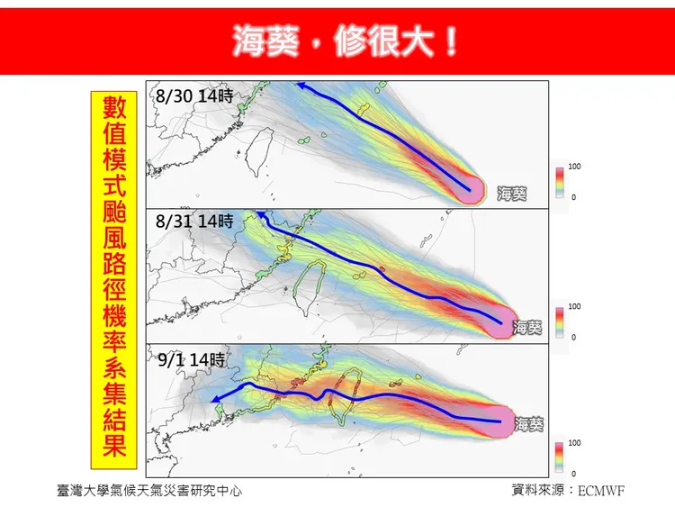 台湾大学大气科学博士林得恩经营的气象粉专「林老师气象站」,今晨发文指出,从欧洲ECMWF数值模式台风路径机率系集结果来看,统计自8/30至9/1,海葵台风路径持续南修,预期从北部外海,到宜兰,到花莲,最后到台东登陆,短短48小时,修正幅度至少500公里以上。