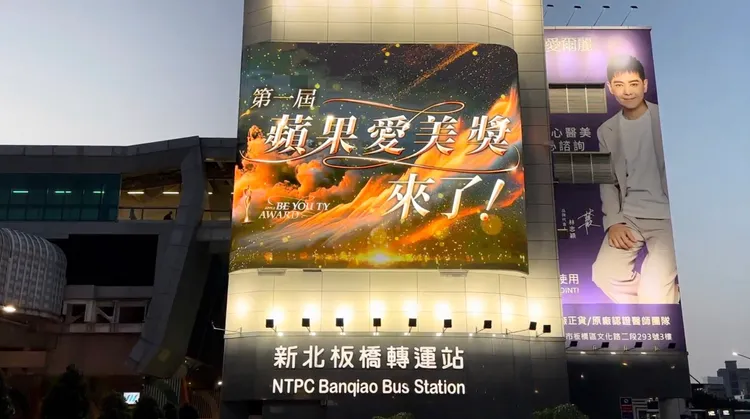 除了线上投票,《苹果爱美奖》也走入城市现场,活动广告已在信义基隆路、忠孝基隆路及板桥火车站等双北流量最高的精华大型电视墙亮相,进一步扩大活动热度。