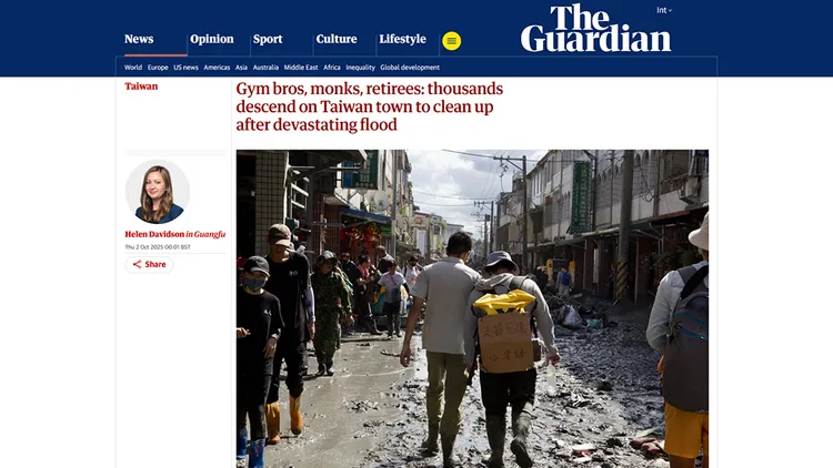 卫报(The Guardian)以「健身迷、僧侣与退休人士:数千人涌入台湾小镇协助灾后清淤」(Gym bros, monks, retirees: thousands descend on Taiwan town to clean up after devastating flood)为题,描绘大批志工抵达光复火车站时,现场群众高喊「加油」的景象。