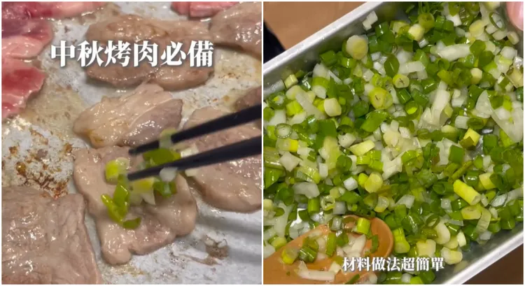 她在贴文中提到,刚好家里提早烤肉,想到冰箱里的葱已经发黄,干脆不浪费,拿来和洋葱、盐、胡椒、橄榄油、香油拌一拌,再放进冰箱冷藏四小时以上,「超级搭,除了葱有一点贵之外没有缺点」。