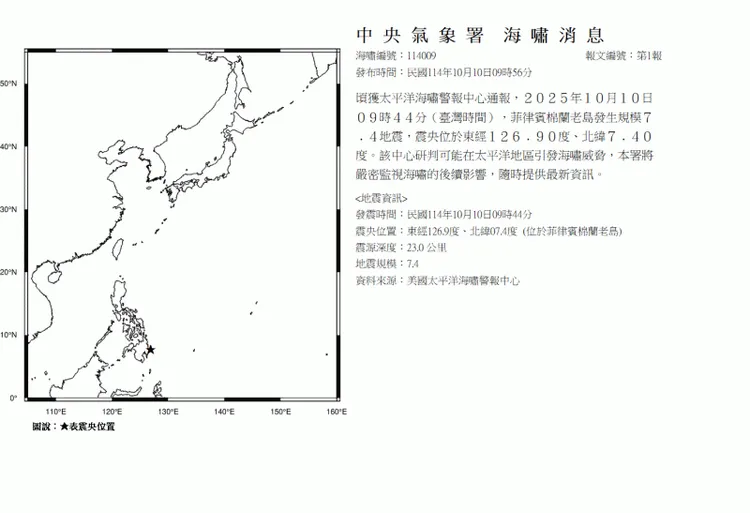 【江宜洁/综合报导】太平洋海啸警报中心通报,台湾时间10日上午9时44分,菲律宾棉兰老岛(东经126.9°、北纬7.4°)发生一起规模7.4地震、震源深度为23.0公里,而中央气象署研判该事件可能于太平洋地区引发海啸威胁,故上午9时56分已发布海啸消息,后续也将严密监视相关影响并随时提供最新资讯。