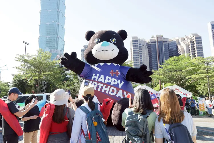 欢庆双十国庆,台北市吉祥物「熊赞」换上首次量身打造的「国庆限定新装」亮相市府前广场,6公尺高的熊赞气偶吸引民众争相合照。现场同步设置结合国旗元素的「熊赞小屋」,即日起至10月12日,民众打卡并追踪熊赞社群帐号,就能获得限量「国庆版熊赞徽章」,每日数量有限。