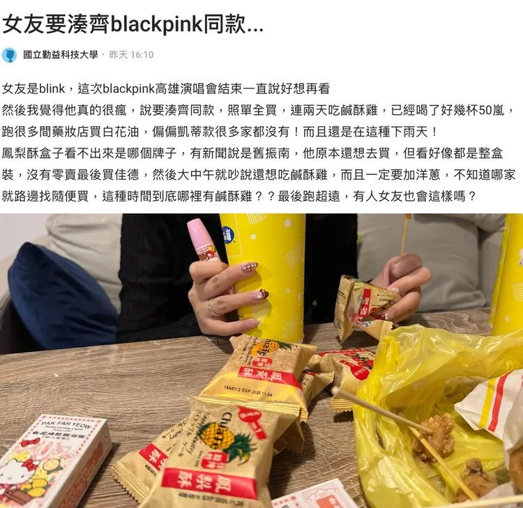 这名网友在 Dcard 发文笑称「女友是 blink,这次参加blackpink高雄演唱会结束回家后,念念不忘一直说好想再看演唱会,然后就只要相关要凑齐同款照单全买!」没想到她咸酥鸡连吃4天、天天喝五十岚、跑遍药妆店要找凯蒂款白花油,连「台湾品牌短裙也指定要 Jennie 同款」,让他直呼「觉得女友真的很疯,有人女友这样吗」、「这波韩星效应太惊人」。
