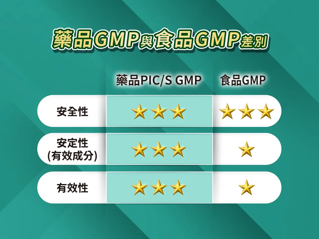 「药品GMP」与「食品GMP」差别*1:药厂GMP制程管控更为严谨,不仅重视「安全性」,同时也须确保「安定性」与「有效性」;而食品GMP则主要著重于「安全性」。