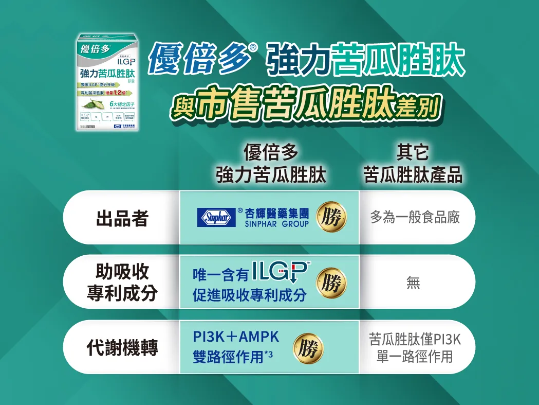 郑医师表示:「由杏辉医药集团研发制造的『优倍多强力苦瓜胜肽』,正是兼具医学背景与科学实证的代表。」杏辉团队结合药学、营养学,历经多阶段实验与稳定性测试,开发出「独家专利ILGP™ +苦瓜胜肽」的升级成分配方。