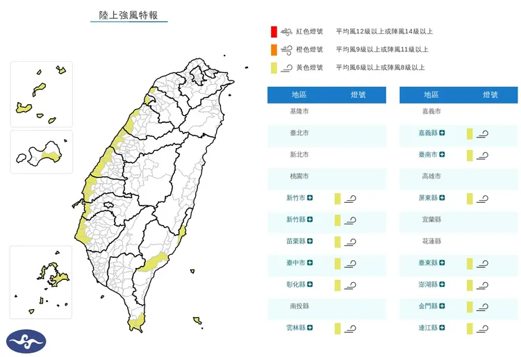 黄色灯号警戒地区有新竹市、新竹县、苗栗县、台中市、彰化县、云林县、嘉义县、台南市、屏东县、台东县、澎湖县、连江县、金门县。在户外请小心路树、不坚固建筑或定置物被强风吹落之碎片;户外工作者请注意安全;加强牢固户外物品;行车减速慢行,留意大众运输延误讯息。