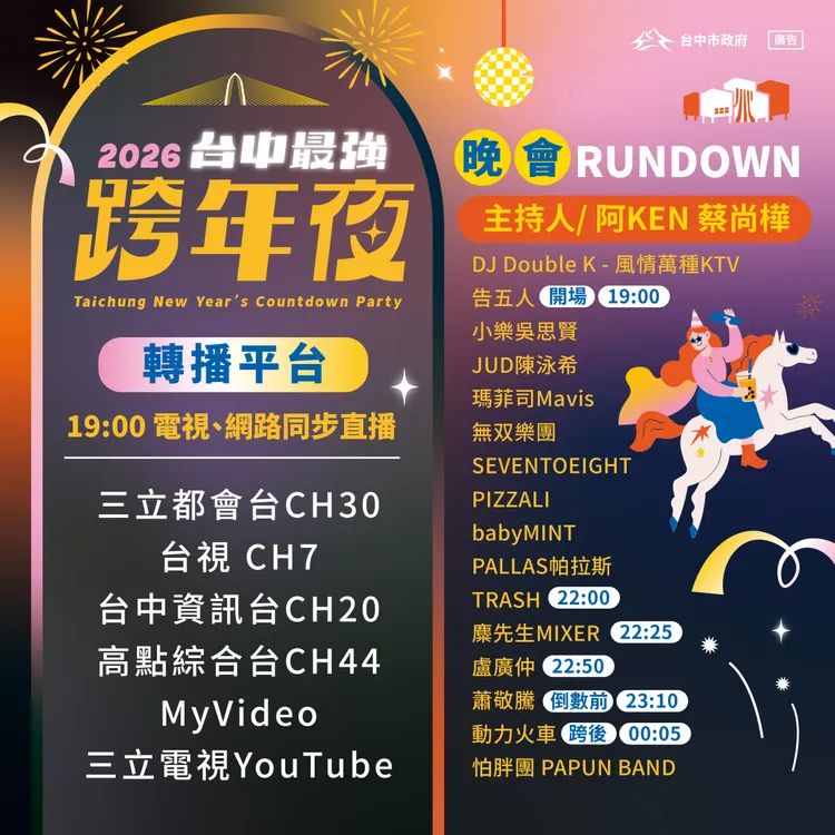 台中市新闻局长栾治谊表示,今年跨年晚会集结「全A咖」卡司,除独家邀请睽违5年回台跨年的萧敬腾外,并网罗多组金奖级音乐人,包括卢广仲、告五人、动力火车、TRASH等,另有麋先生 MIXER、吴思贤、PIZZALI、薄荷水晶、SEVENTOEIGHT、陈泳希、帕拉斯、无双乐团、DJ Double K-风情万种KTV、Mavis玛菲司等共16组艺人轮番登台,并搭配180秒高空璀璨烟火秀,陪伴民众一同迎接马年到来。