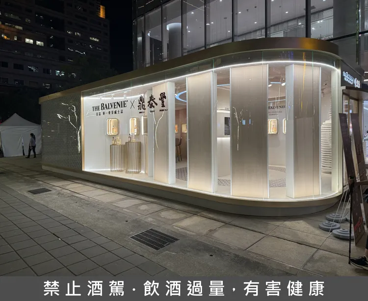 《百富丰味交飨联名体验店》场域以「双圆相连」象征橡木桶与蒸笼,采艺廊式动线铺陈百富「自种大麦、地板发芽、自聘铜匠、桶匠团队与首席调酒师」五大工艺;鼎泰丰则以面皮厚薄、馅料比例与「十八折」定型对位呈现。