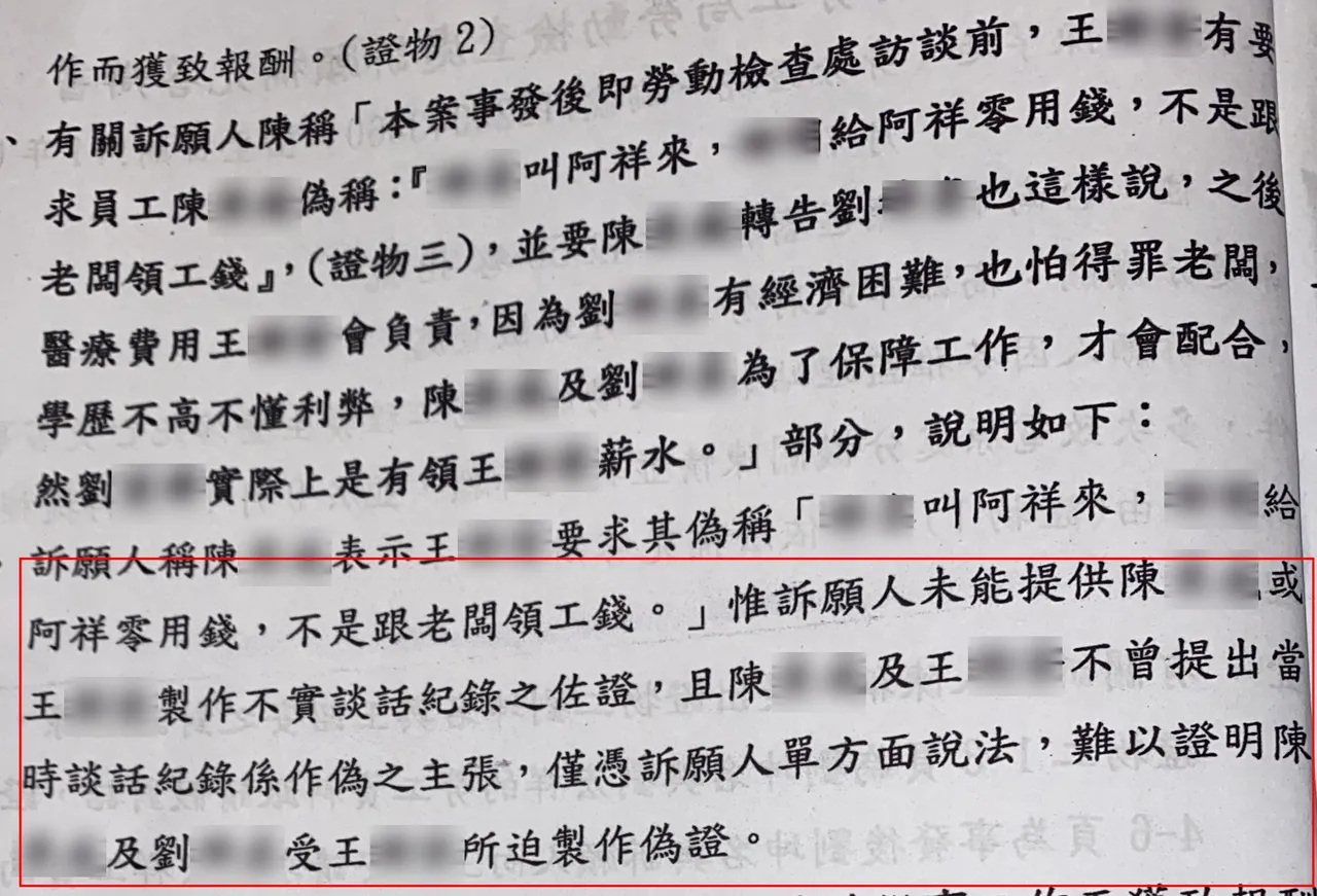 她得知真相后,找出儿子与雇主的LINE对话纪录,有派工、支薪、汇款等细节,她还策动2名工人吐实,出示具签的自白书,再三证明确有劳资关系,向劳工局提起诉愿,却收到回函「主观臆测,难遽以采认」,深感心寒。