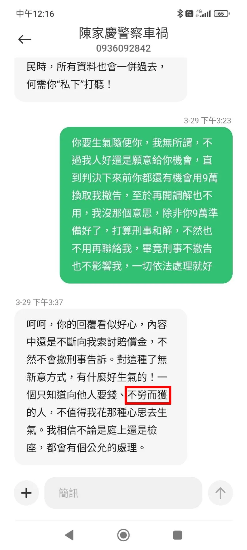 然而施男也指控,在调解过程中,陈员毫无诚意,更以简讯呛声:「对这种『了无新意』的方式,有什么好生气的!一个『只知道向他人要钱』、『不劳而获』的人,不值得我花那种心思去生气」。
