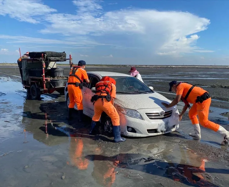 海巡人员到场发现系黄姓游客将轿车开进沙滩,车辆陷于沙泥地中,无法自行脱困,立即协调当地友好蚵车业者以蚵车方式拖带车辆,并以人力辅助推行,顺利协助车辆脱困开返岸际,驾驶黄先生感谢海巡人员即时协助,整起事件圆满落幕。