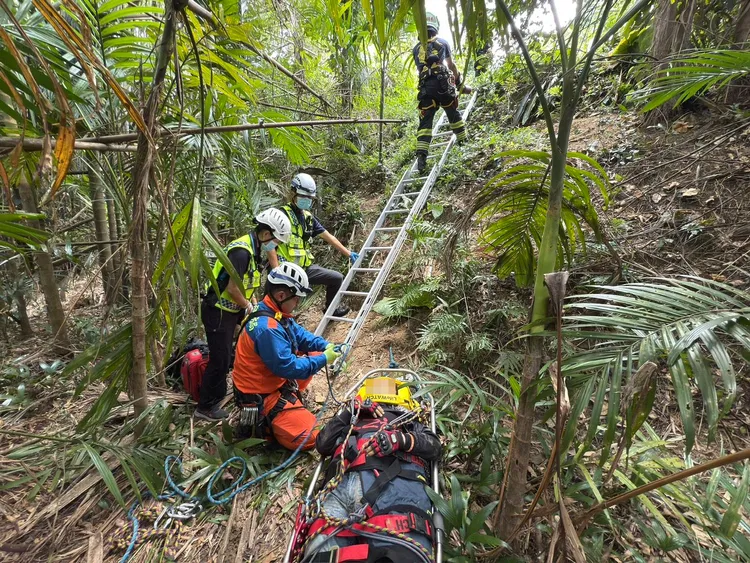 消防人员深入边坡接触患者,发现他左胸及左大腿疼痛无法行走,于是使用长背板、抽吸式护木及篮式担架固定伤患,使用吊臂将患者上拉脱困,送医治疗;事故原因由警方进一步调查。