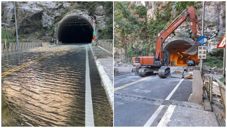 太鲁阁国家公园燕子口步道950公尺处边坡崩塌,形成堰塞湖,湖水今天凌晨0时许漫淹台8线靳珩隧道,并稳定回流至立雾溪主河道。