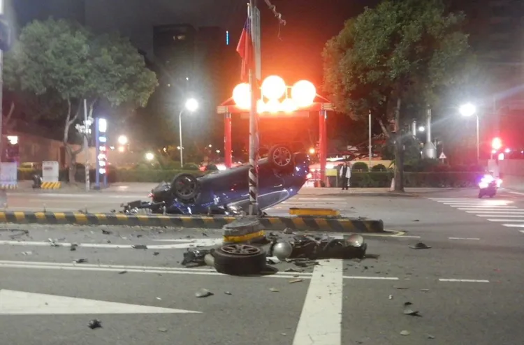 台中市警四分局今天凌晨2时41分接获报案,南屯区惠中路与市政北三路口发生一起自撞事故。警方到场发现是1辆玛莎拉蒂轿车,沿惠中路往西屯路方向行驶,失控碰撞中央分隔岛翻覆,巨大的撞击力把分隔岛水泥块撞断,玛莎拉蒂前保杆脱落,1颗轮胎也撞飞,零件散落一地。