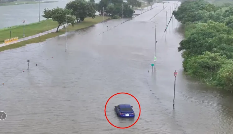 【记者曾佳俊/新北报导】受东北季风及风神台风外围环流共伴效应影响,中央气象局针对台北市及新北市发布豪雨特报,其中贯穿新北市五股、芦洲、三重及新庄区的二重疏洪道,今(20)日上午积水过深来不及退,市府紧急进行交管与封闭越堤道。民众空拍画面也跟著曝光,发现整段宽敞的疏洪道路被水流覆盖,变成一片水乡泽国,不少行驶中的汽车当场在路中央抛锚受困,所幸人已被救离,另外内部停车场出入道路完全被封锁,停放车辆跟著遭殃,积水高度可见超过半个轮胎,车身惨被泥水浸泡其中。