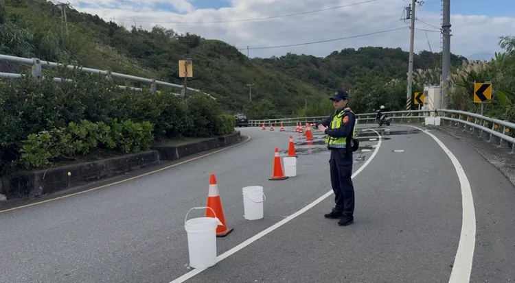 警方调阅监视器发现一辆营业曳引车行经台11线28.5K处时,因装载不稳导致装容麦芽糖的水桶掉落,黏稠液体铺满路面长达100公尺,造成后方2名骑士辗压打滑,造成手脚多处擦挫伤,所幸伤势无大碍。