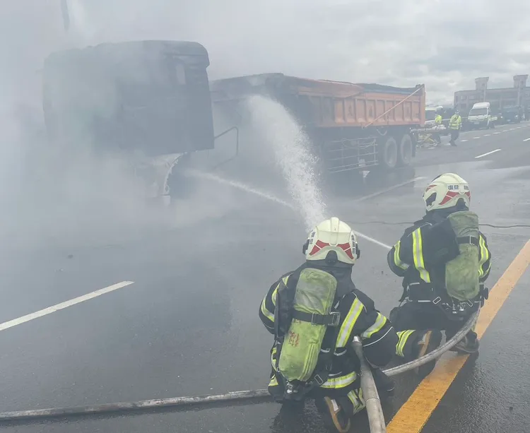 警、消表示,今天上午10时38分许据报在台66西向18.5公里平镇路段发生火烧车事故,经派员前往,现场为砂石车在行进中车头燃烧,驾驶及时停车逃生,无人员受困或受伤,经出动消防人员12名、消防车4辆、救护车1辆到场灌救后,火势在10分钟内扑灭,起火原因调查中。