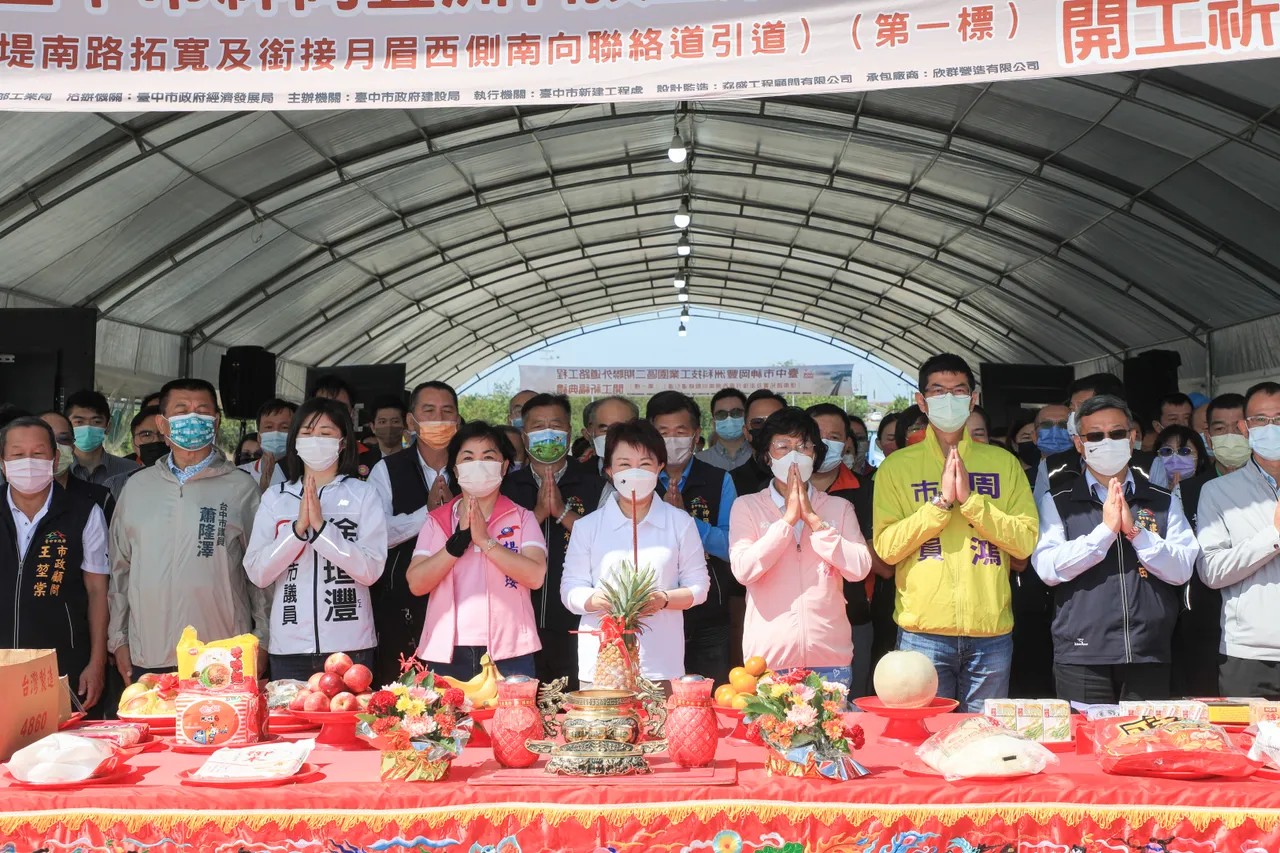 卢秀燕与立委杨琼璎、市议员周永鸿、罗永珍、徐瑄沣、萧隆泽等人,为丰洲科技工业园区二期联外道路动工祈福。台中市政府提供