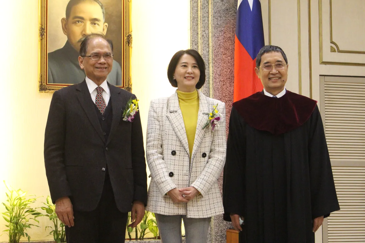 王鸿薇与立法院长游锡堃(左)、大法官进行合影。潘袁诗羽摄