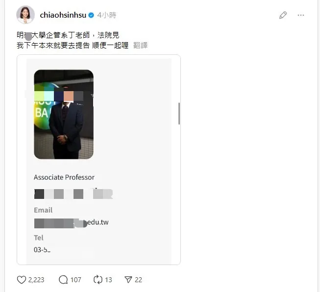 【记者李俊毅/台北报导】一名网友今日在Threads发文表示,「回头看徐巧芯等蓝营论文抄袭都没事,林智坚却被攻击的体无完肤。媒体的公平性在哪里?赖瑞隆希望记起教训挺住,高雄人支持你。」但此说法,却让被指控的徐巧芯感到莫名其妙,强调自己正准备论文「研究计划」而已,哪来抄袭可能,造谣没下限。更表示「法院见,自己下午本来就要去提告,顺便一起。」